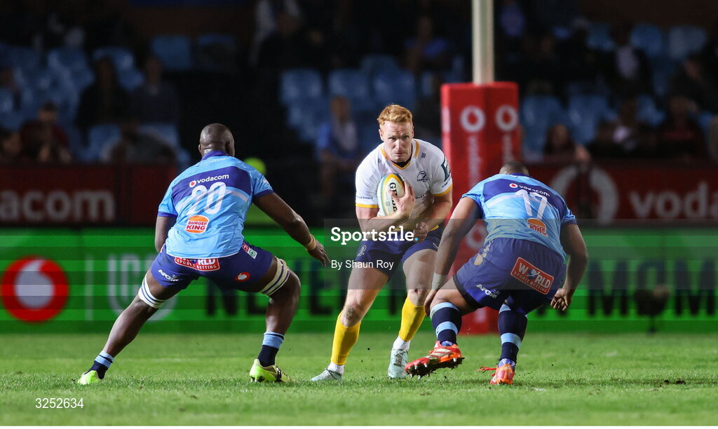 4 October 2025; Ciarán Frawley of Leinster in action against Nama Xaba, left, and Alulutho Tshakweni of Vodacom Bulls during the United Rugby Championship match between Vodacom Bulls and Leinster at Loftus Versfeld Stadium in Pretoria, South Africa. Photo by Shaun Roy/Sportsfile