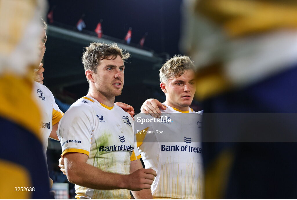 4 October 2025; Leinster captain Luke McGrath talks to teammates after the United Rugby Championship match between Vodacom Bulls and Leinster at Loftus Versfeld Stadium in Pretoria, South Africa. Photo by Shaun Roy/Sportsfile