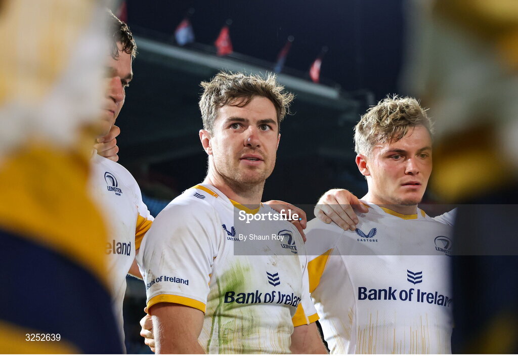4 October 2025; Leinster captain Luke McGrath talks to teammates after the United Rugby Championship match between Vodacom Bulls and Leinster at Loftus Versfeld Stadium in Pretoria, South Africa. Photo by Shaun Roy/Sportsfile
