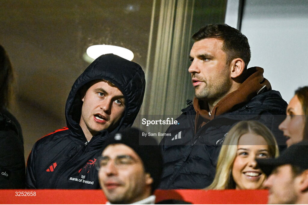 4 October 2025; Injured Munster players Craig Casey and Tadhg Beirne in attendance during the United Rugby Championship match between Munster and Cardiff Rugby at Thomond Park in Limerick. Photo by Sam Barnes/Sportsfile