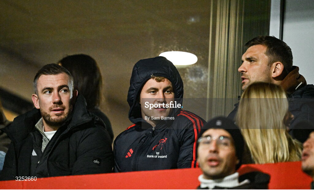 4 October 2025; Injured Munster players, from left, JJ Hanrahan, Craig Casey and Tadhg Beirne in attendance during the United Rugby Championship match between Munster and Cardiff Rugby at Thomond Park in Limerick. Photo by Sam Barnes/Sportsfile