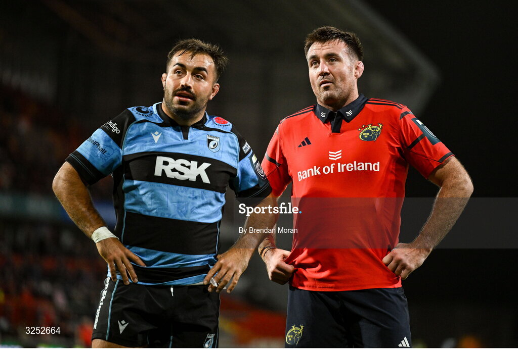 4 October 2025; Munster captain Niall Scannell, right, and Cardiff captain Liam Belcher converse as referee Adam Jones, not pictured, makes a TMO decision during the United Rugby Championship match between Munster and Cardiff Rugby at Thomond Park in Limerick. Photo by Brendan Moran/Sportsfile