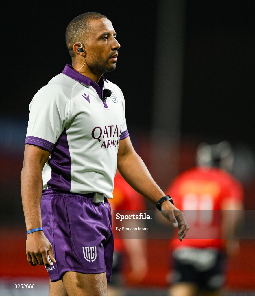 4 October 2025; Referee Griffin Colby during the United Rugby Championship match between Munster and Cardiff Rugby at Thomond Park in Limerick. Photo by Brendan Moran/Sportsfile