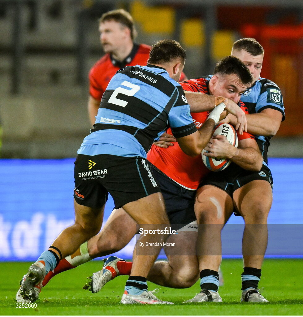 4 October 2025; Niall Scannell of Munster is tackled by Cardiff players Liam Belcher, left, and Danny Southworth during the United Rugby Championship match between Munster and Cardiff Rugby at Thomond Park in Limerick. Photo by Brendan Moran/Sportsfile