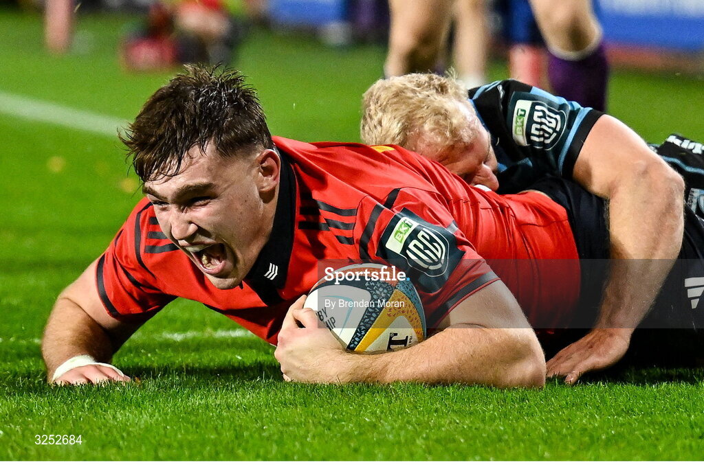 4 October 2025; Ruadhan Quinn of Munster celebrates after scoring his side's first try during the United Rugby Championship match between Munster and Cardiff Rugby at Thomond Park in Limerick. Photo by Brendan Moran/Sportsfile