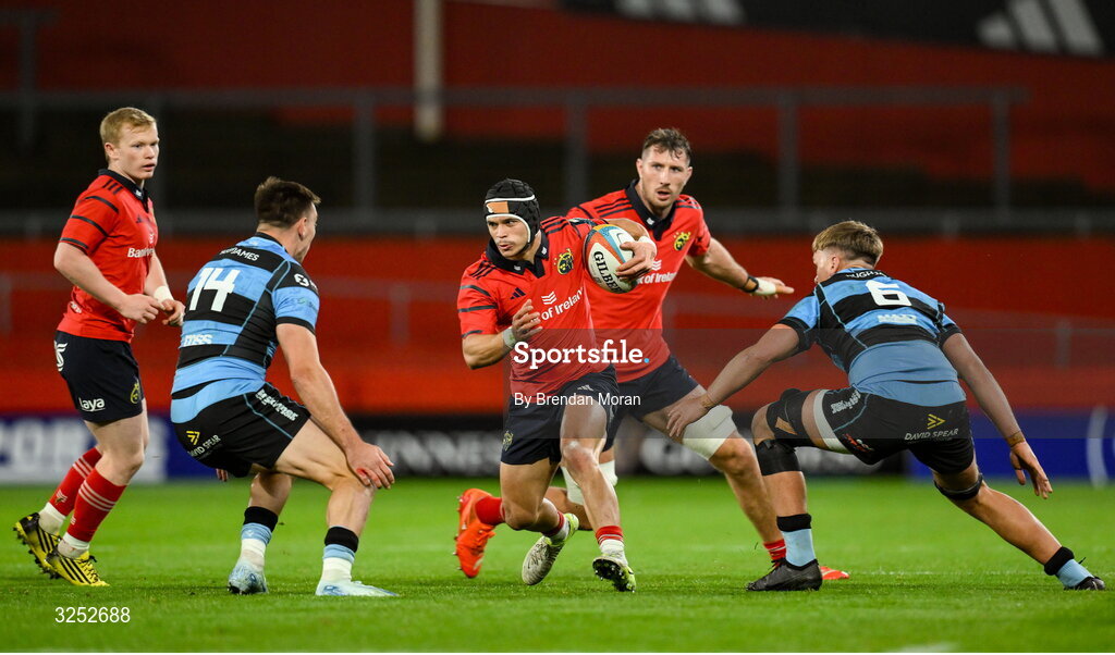 4 October 2025; Thaakir Abrahams of Munster in action against Cardiff players Josh Adams, left, and Alex Mann during the United Rugby Championship match between Munster and Cardiff Rugby at Thomond Park in Limerick. Photo by Brendan Moran/Sportsfile