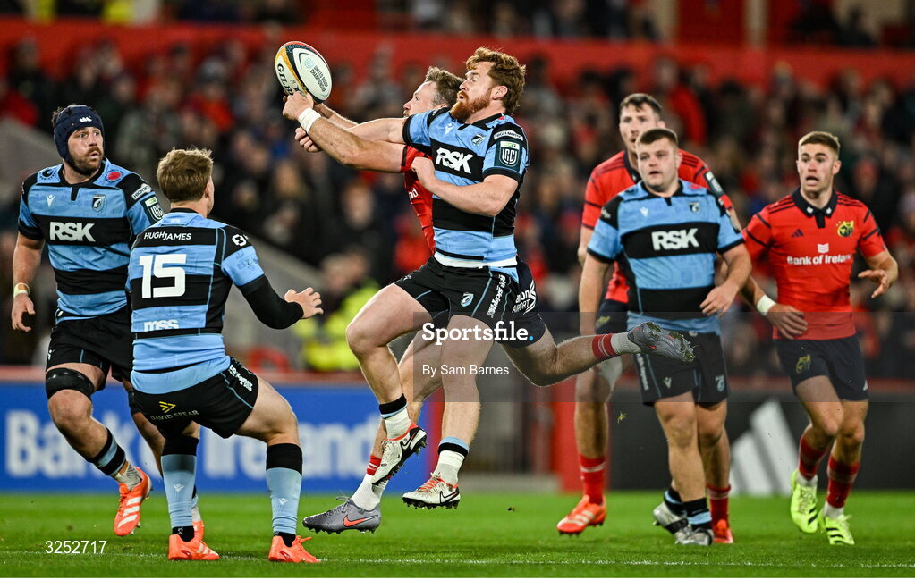 4 October 2025; Sean O'Brien of Munster and Rory Jennings of Cardiff Rugby contest a high ball during the United Rugby Championship match between Munster and Cardiff Rugby at Thomond Park in Limerick. Photo by Sam Barnes/Sportsfile