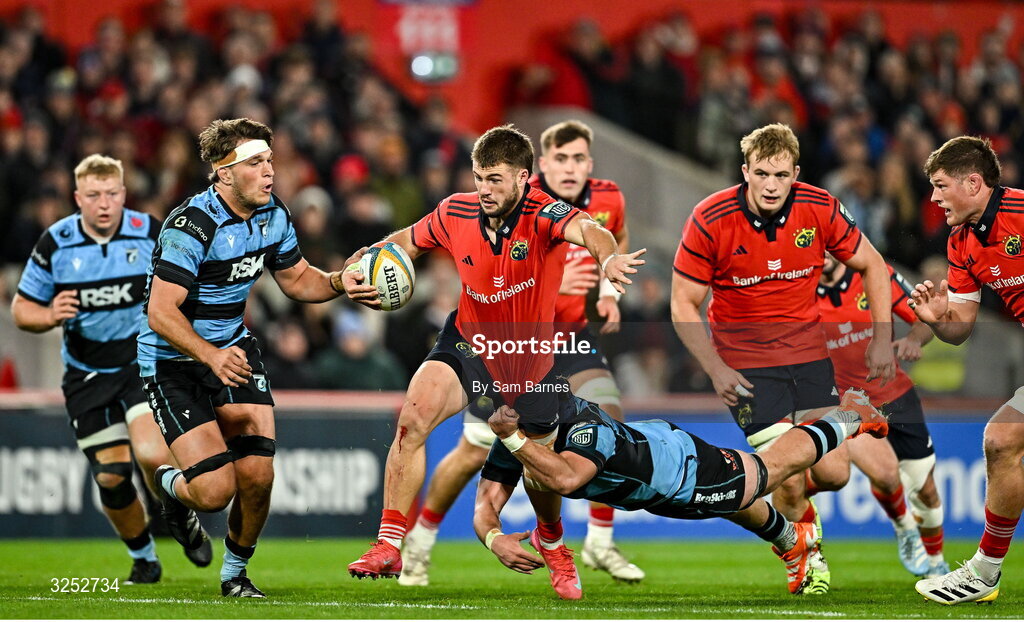4 October 2025; Alex Nankivell of Munster is tackled by Cardiff players Teddy Williams, left, and Alun Lawrence during the United Rugby Championship match between Munster and Cardiff Rugby at Thomond Park in Limerick. Photo by Sam Barnes/Sportsfile