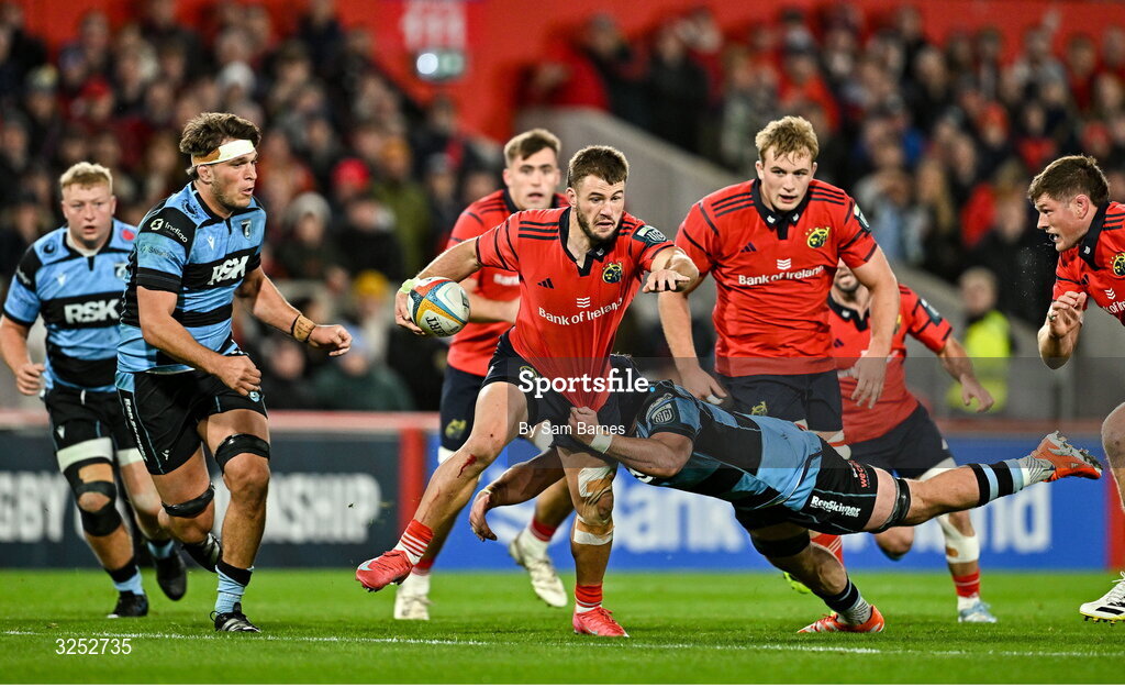 4 October 2025; Alex Nankivell of Munster is tackled by Rory Jennings of Cardiff Rugby during the United Rugby Championship match between Munster and Cardiff Rugby at Thomond Park in Limerick. Photo by Sam Barnes/Sportsfile