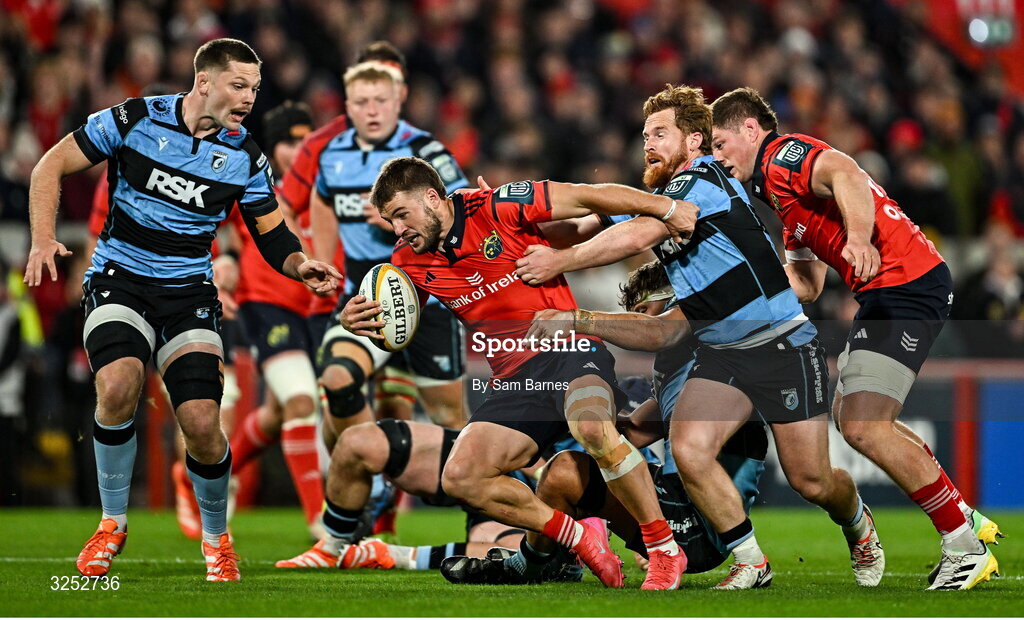 4 October 2025; Alex Nankivell of Munster is tackled by Rory Jennings of Cardiff Rugby during the United Rugby Championship match between Munster and Cardiff Rugby at Thomond Park in Limerick. Photo by Sam Barnes/Sportsfile