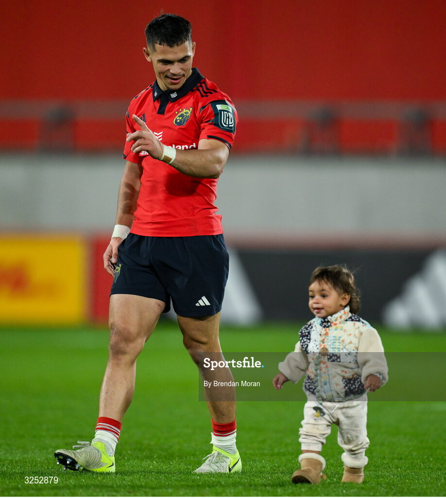 4 October 2025; Thaakir Abrahams of Munster with his daughter Diyaana on the pitch after the United Rugby Championship match between Munster and Cardiff Rugby at Thomond Park in Limerick. Photo by Brendan Moran/Sportsfile