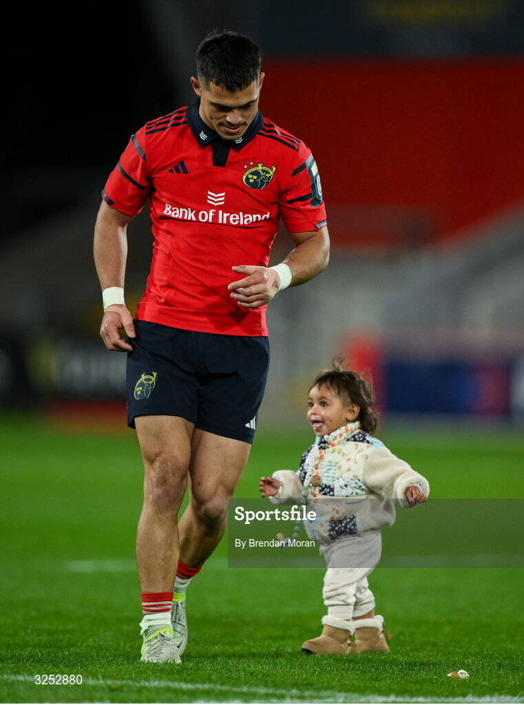4 October 2025; Thaakir Abrahams of Munster with his daughter Diyaana on the pitch after the United Rugby Championship match between Munster and Cardiff Rugby at Thomond Park in Limerick. Photo by Brendan Moran/Sportsfile