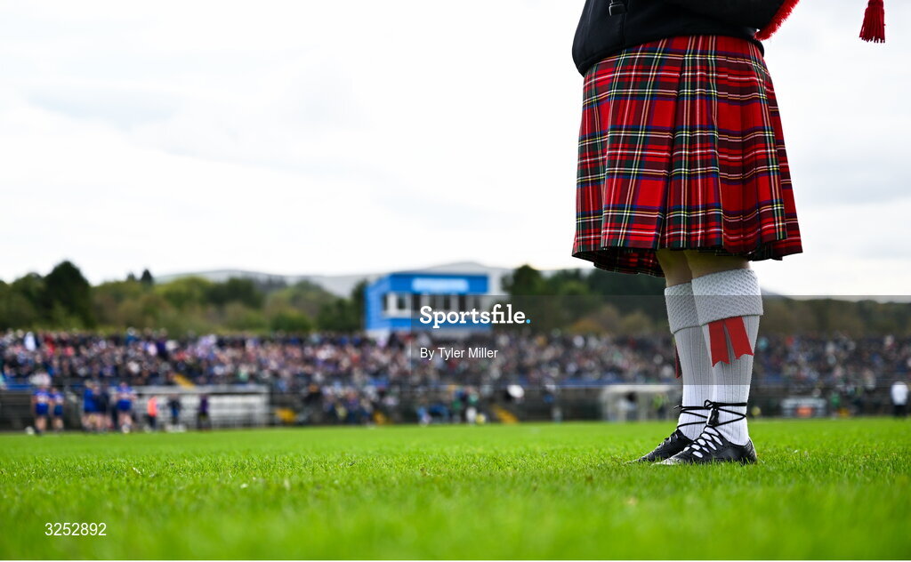 5 October 2025; A Kilt is seen on a memeber of the Michael Dwyer Pipe Band Aughrim before the Wicklow County Senior Club Football Championship final match between Baltinglass and Carnew Emmets at Echelon Park, Aughrim. Photo by Tyler Miller/Sportsfile