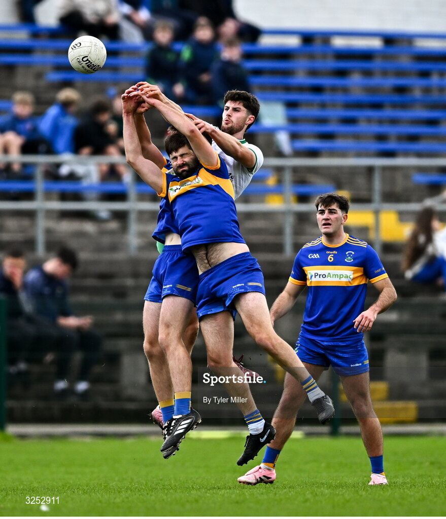 5 October 2025; Ben Brosnan, front, and Kenneth Cullen of Carnew Emmetts, hidden, in action against Jack Kirwan of Baltinglass during the Wicklow County Senior Club Football Championship final match between Baltinglass and Carnew Emmets at Echelon Park, Aughrim. Photo by Tyler Miller/Sportsfile