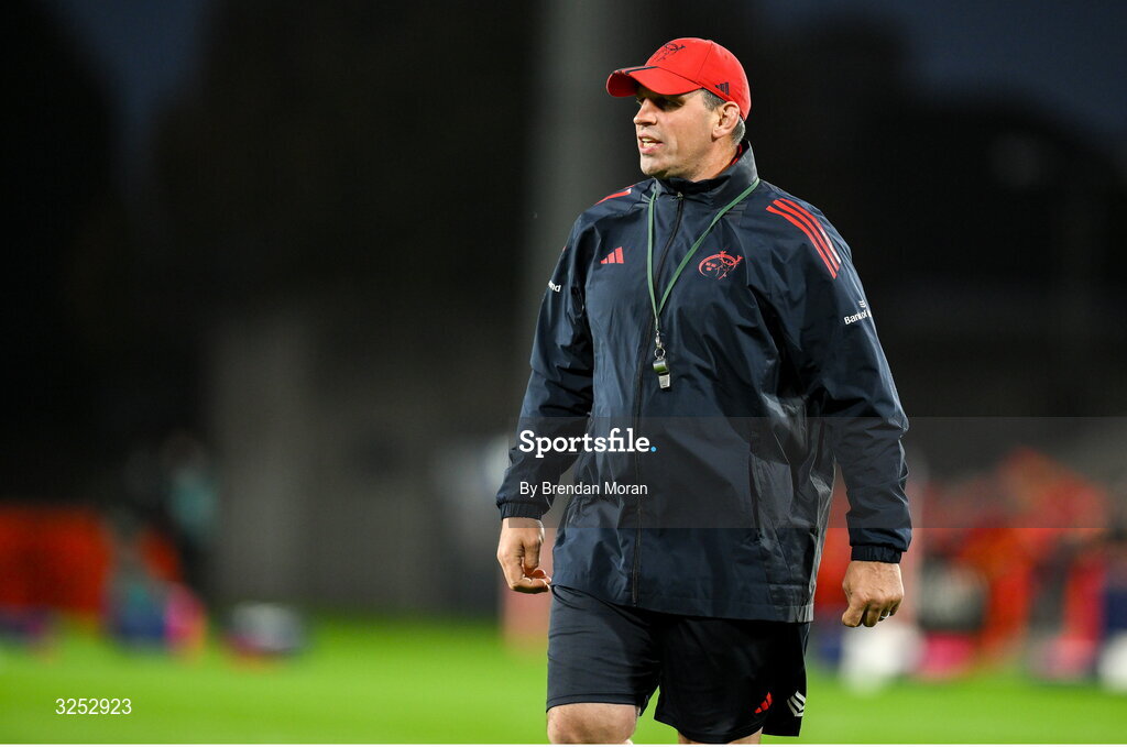 4 October 2025; Munster defence coach Denis Leamy before the United Rugby Championship match between Munster and Cardiff Rugby at Thomond Park in Limerick. Photo by Brendan Moran/Sportsfile