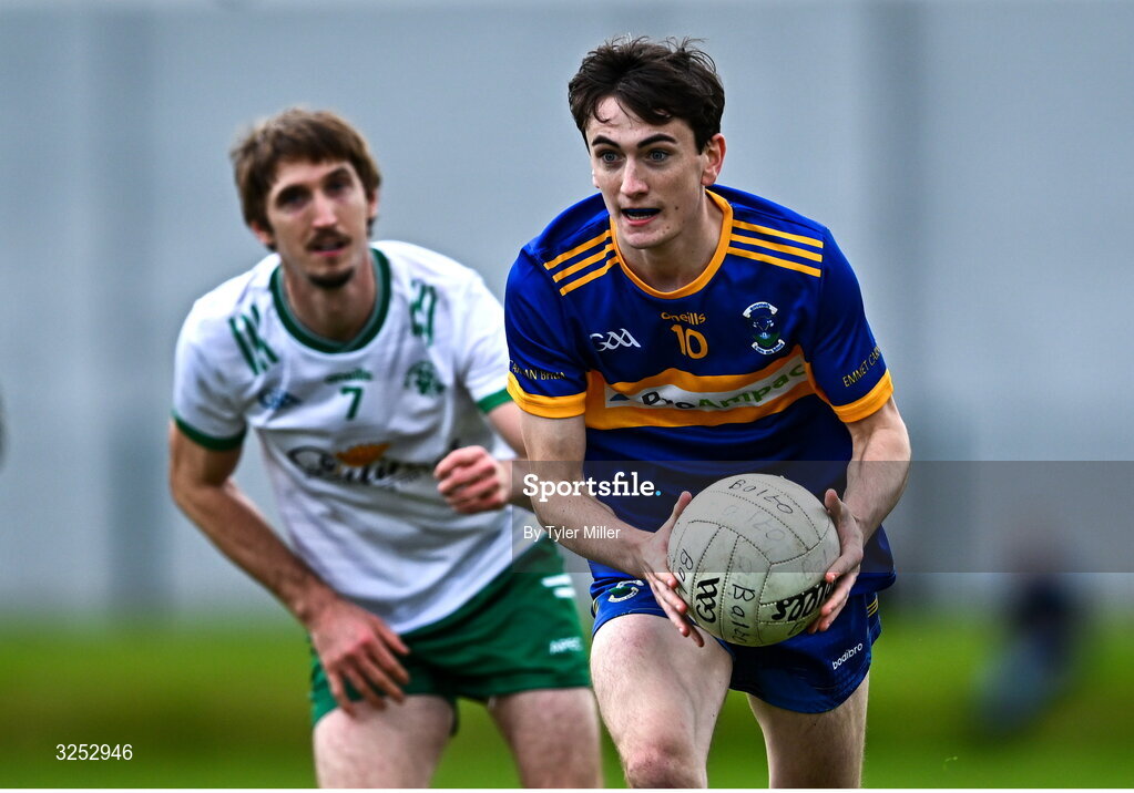 5 October 2025; Richard Greene of Carnew Emmetts in action against Pat Burke of Baltinglass during the Wicklow County Senior Club Football Championship final match between Baltinglass and Carnew Emmets at Echelon Park, Aughrim. Photo by Tyler Miller/Sportsfile