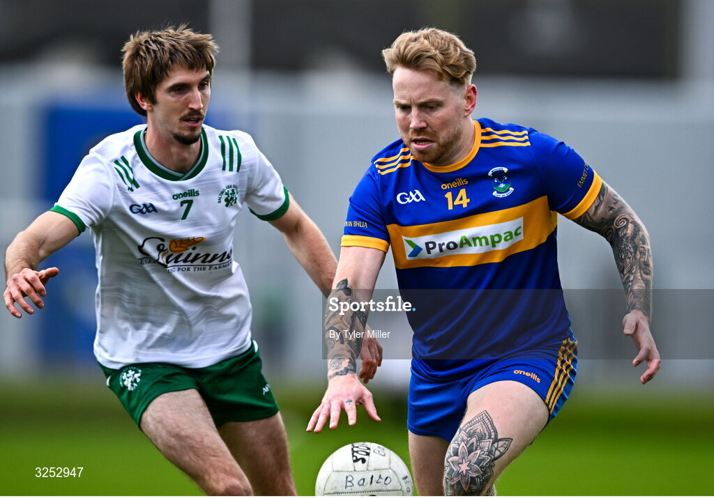 5 October 2025; Conall McCrea of Carnew Emmetts in action against Pat Burke of Baltinglass during the Wicklow County Senior Club Football Championship final match between Baltinglass and Carnew Emmets at Echelon Park, Aughrim. Photo by Tyler Miller/Sportsfile
