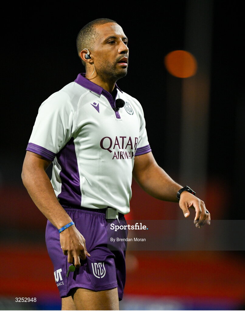 4 October 2025; Referee Griffin Colby during the United Rugby Championship match between Munster and Cardiff Rugby at Thomond Park in Limerick. Photo by Brendan Moran/Sportsfile