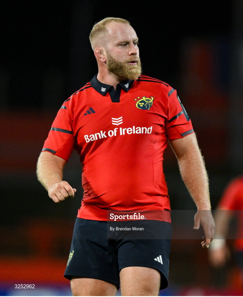 4 October 2025; Jeremy Loughman of Munster during the United Rugby Championship match between Munster and Cardiff Rugby at Thomond Park in Limerick. Photo by Brendan Moran/Sportsfile