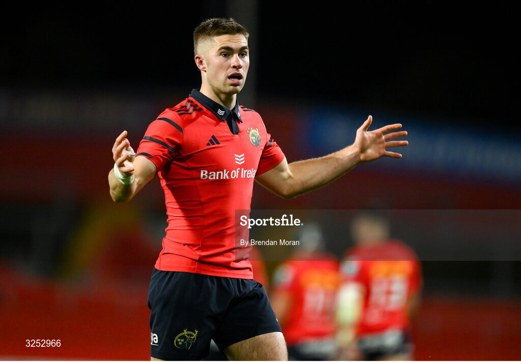 4 October 2025; Jack Crowley of Munster during the United Rugby Championship match between Munster and Cardiff Rugby at Thomond Park in Limerick. Photo by Brendan Moran/Sportsfile