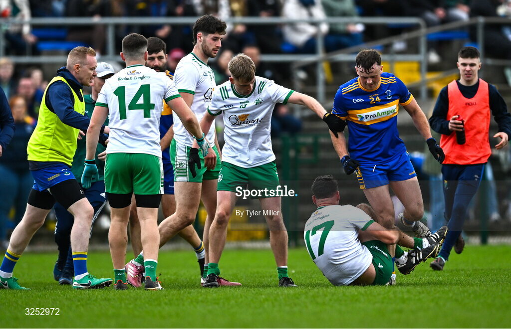 5 October 2025; Jack Doyle of Carnew Emmetts, right, tussles with Sean Doody of Baltinglass during the Wicklow County Senior Club Football Championship final match between Baltinglass and Carnew Emmets at Echelon Park, Aughrim. Photo by Tyler Miller/Sportsfile