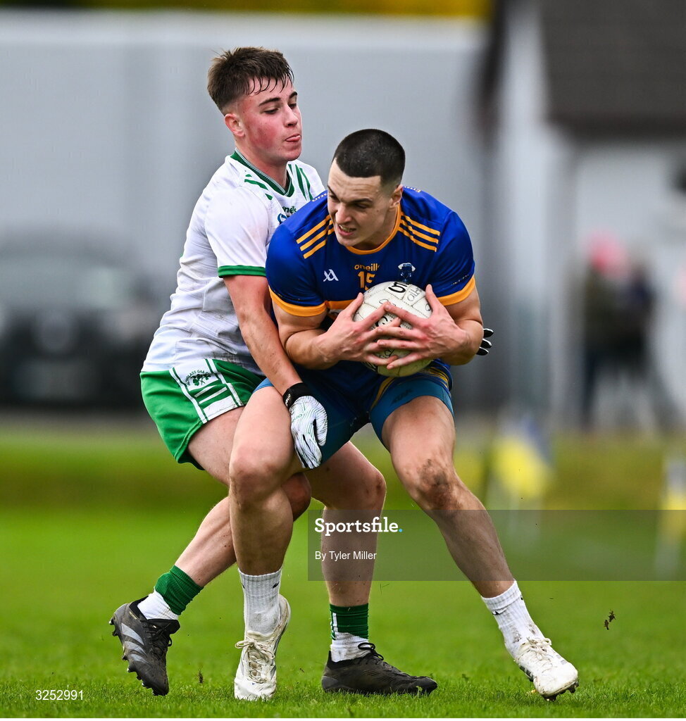5 October 2025; Sean Murphy of Carnew Emmetts in action against James Fleming of Baltinglass during the Wicklow County Senior Club Football Championship final match between Baltinglass and Carnew Emmets at Echelon Park, Aughrim. Photo by Tyler Miller/Sportsfile