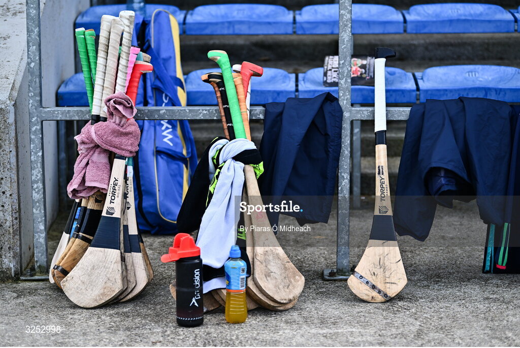 5 October 2025; Spare hurls on the sideline before the Clare County Senior Club Hurling Championship final match between Clooney Quin and Éire Óg Ennis at Zimmer Biomet Páirc Chíosóg in Ennis, Clare. Photo by Piaras Ó Mídheach/Sportsfile