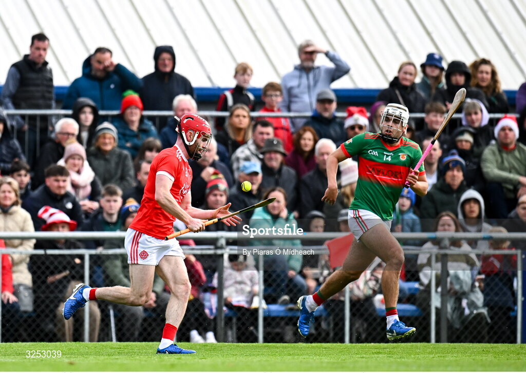 5 October 2025; Liam Corry of Éire Óg Ennis in action against Callum Hassett of Clooney Quin during the Clare County Senior Club Hurling Championship final match between Clooney Quin and Éire Óg Ennis at Zimmer Biomet Páirc Chíosóg in Ennis, Clare. Photo by Piaras Ó Mídheach/Sportsfile