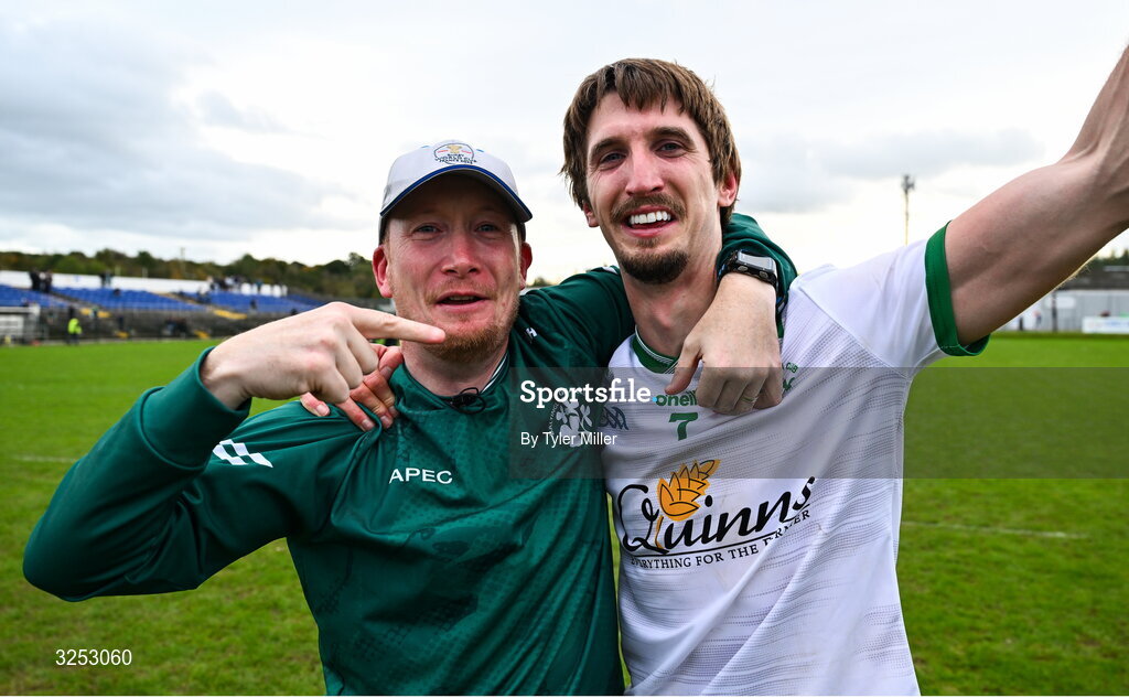 5 October 2025; Baltinglass captain Pat Burke celebrates with Baltinglass manager Barry Hayes after the Wicklow County Senior Club Football Championship final match between Baltinglass and Carnew Emmets at Echelon Park, Aughrim. Photo by Tyler Miller/Sportsfile