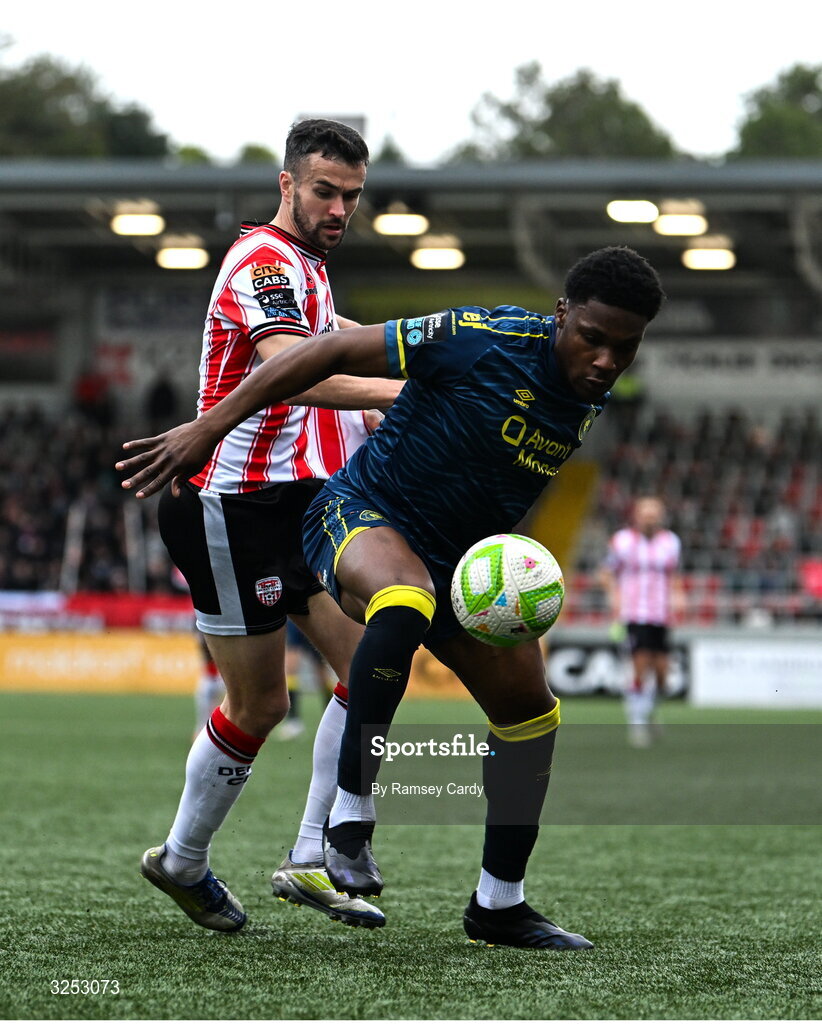 5 October 2025; Edwin Agbaje of Sligo Rovers in action against Michael Duffy of Derry City during the SSE Airtricity Men's Premier Division match between Derry City and Sligo Rovers at The Ryan McBride Brandywell Stadium in Derry. Photo by Ramsey Cardy/Sportsfile