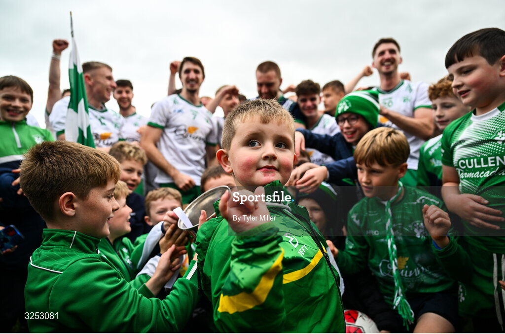 5 October 2025; A young Baltinglass supporter celebrates after the Wicklow County Senior Club Football Championship final match between Baltinglass and Carnew Emmets at Echelon Park, Aughrim. Photo by Tyler Miller/Sportsfile