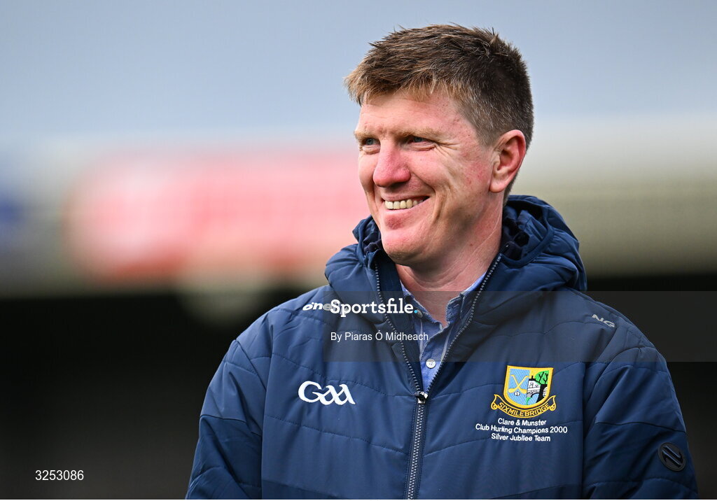 5 October 2025; Former Clare hurler Niall Gilligan on the pitch as his Sixmilebridge team are celebrated for their 2000 Clare SHC Final win at half-time during the Clare County Senior Club Hurling Championship final match between Clooney Quin and Éire Óg Ennis at Zimmer Biomet Páirc Chíosóg in Ennis, Clare. Photo by Piaras Ó Mídheach/Sportsfile