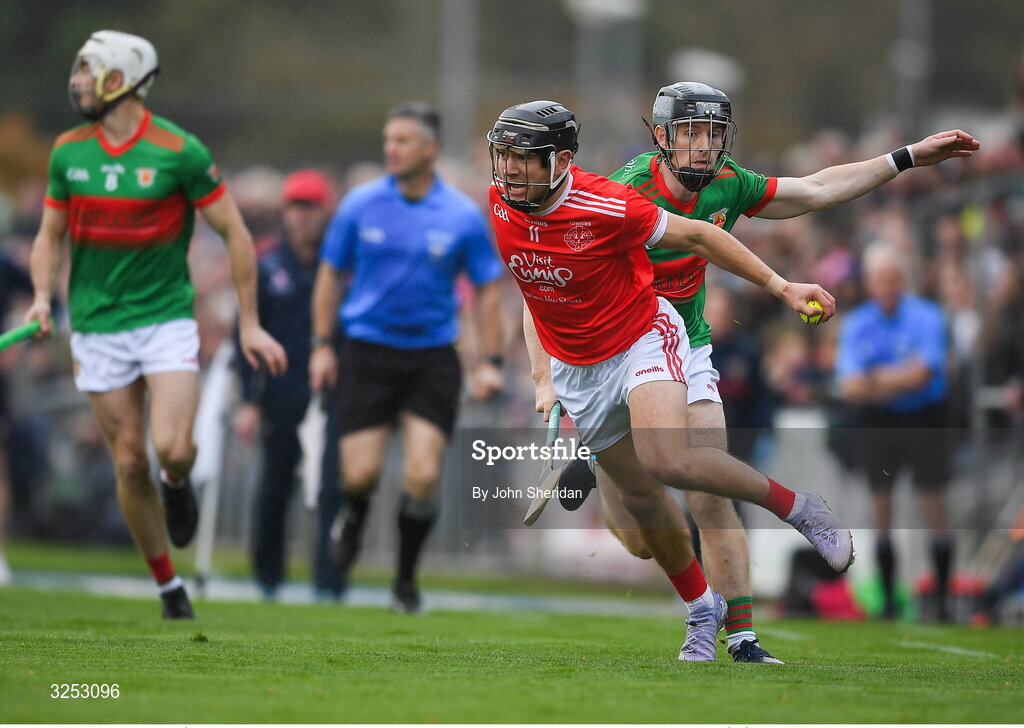 5 October 2025; David Reidy of Éire Og in action against Jimmy Corry of Clooney Quin during the Clare County Senior Club Hurling Championship final match between Clooney Quin and Éire Óg Ennis at Zimmer Biomet Páirc Chíosóg in Ennis, Clare. Photo by John Sheridan/Sportsfile