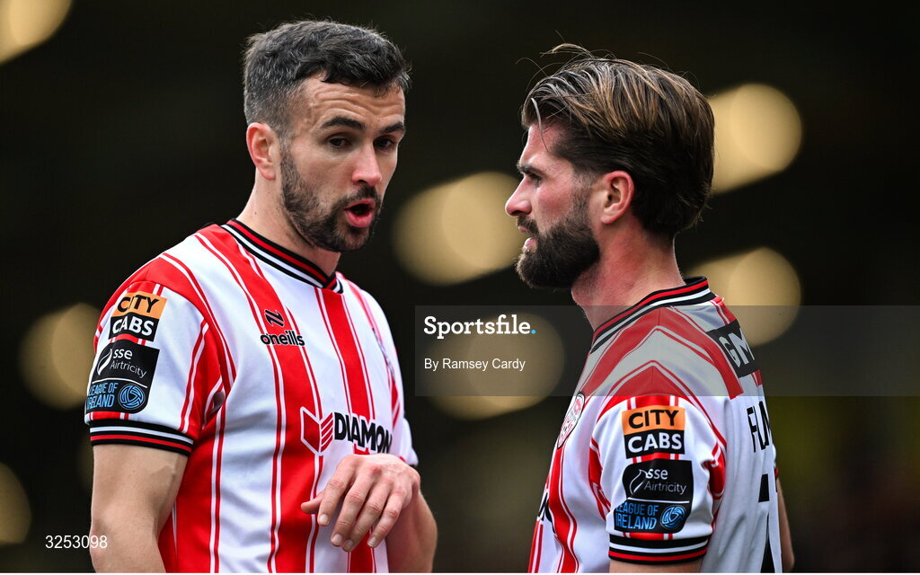5 October 2025; Michael Duffy, left, and Brandon Fleming of Derry City during the SSE Airtricity Men's Premier Division match between Derry City and Sligo Rovers at The Ryan McBride Brandywell Stadium in Derry. Photo by Ramsey Cardy/Sportsfile