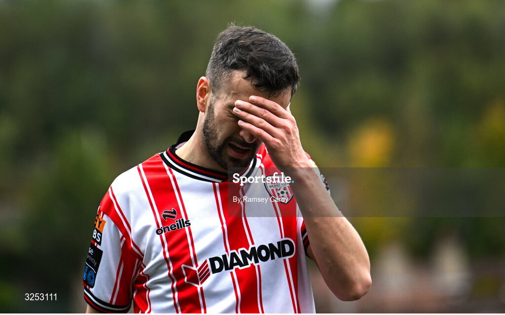 5 October 2025; Michael Duffy of Derry City reacts during the SSE Airtricity Men's Premier Division match between Derry City and Sligo Rovers at The Ryan McBride Brandywell Stadium in Derry. Photo by Ramsey Cardy/Sportsfile