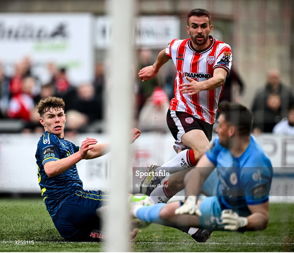 5 October 2025; Michael Duffy of Derry City has a shot at goal saved by Sligo Rovers goalkeeper Sam Sargeant during the SSE Airtricity Men's Premier Division match between Derry City and Sligo Rovers at The Ryan McBride Brandywell Stadium in Derry. Photo by Ramsey Cardy/Sportsfile