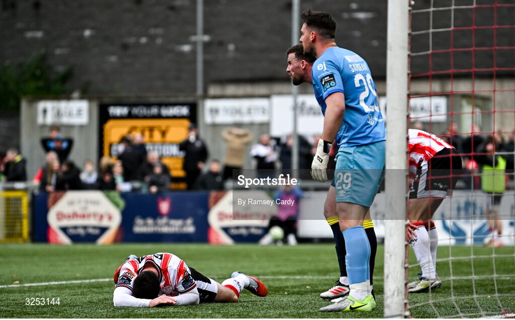 5 October 2025; Danny Mullen of Derry City reacts after a missed chance during the SSE Airtricity Men's Premier Division match between Derry City and Sligo Rovers at The Ryan McBride Brandywell Stadium in Derry. Photo by Ramsey Cardy/Sportsfile