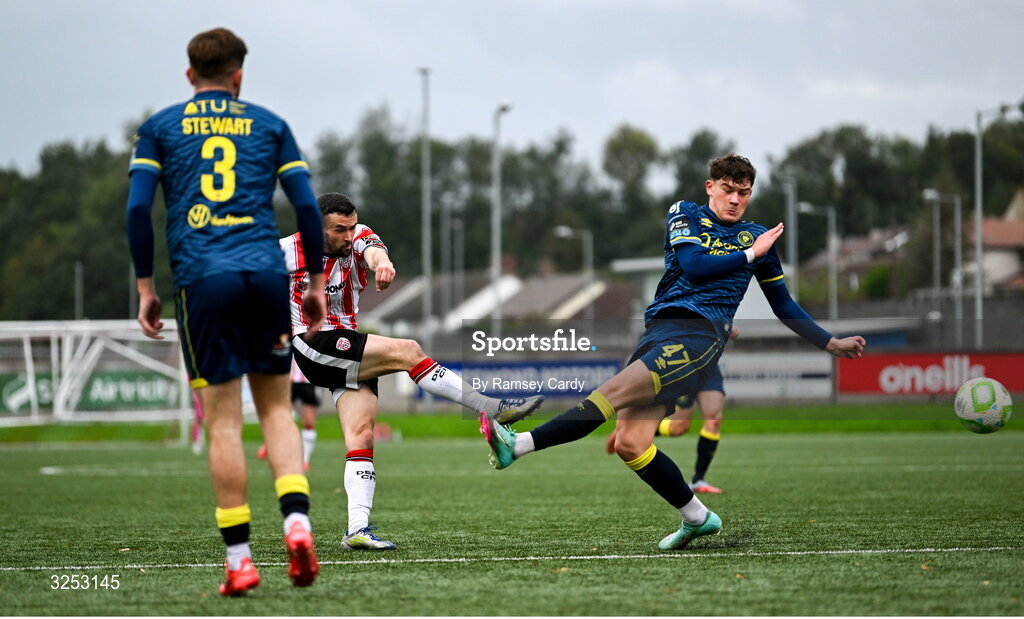 5 October 2025; Michael Duffy of Derry City shoots under pressure from Owen Elding of Sligo Rovers during the SSE Airtricity Men's Premier Division match between Derry City and Sligo Rovers at The Ryan McBride Brandywell Stadium in Derry. Photo by Ramsey Cardy/Sportsfile