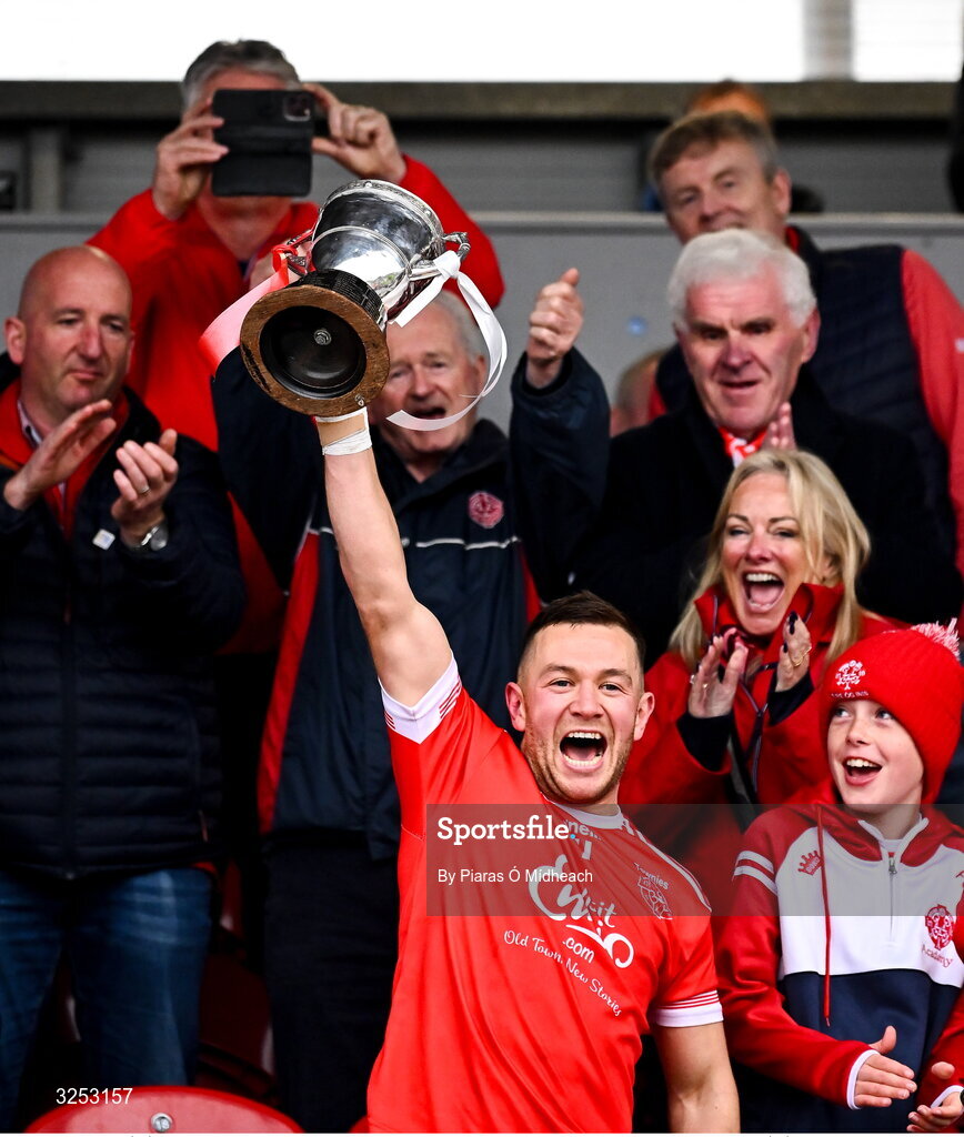 5 October 2025; Éire Óg Ennis captain David Reidy lifts the Canon Hamilton Cup after his side's victory in the Clare County Senior Club Hurling Championship final match between Clooney Quin and Éire Óg Ennis at Zimmer Biomet Páirc Chíosóg in Ennis, Clare. Photo by Piaras Ó Mídheach/Sportsfile