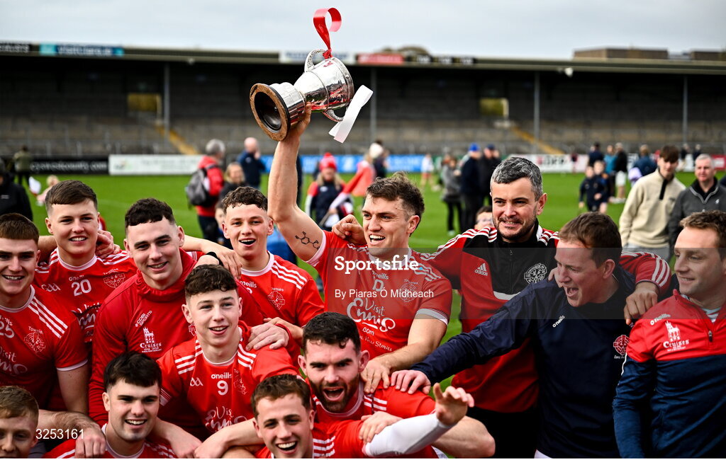 5 October 2025; Shane O'Donnell of Éire Óg Ennis celebrates with the Canon Hamilton cup after victory in the Clare County Senior Club Hurling Championship final match between Clooney Quin and Éire Óg Ennis at Zimmer Biomet Páirc Chíosóg in Ennis, Clare. Photo by Piaras Ó Mídheach/Sportsfile