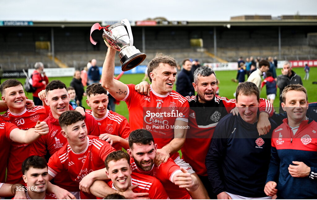 5 October 2025; Shane O'Donnell of Éire Óg Ennis celebrates with the Canon Hamilton cup after victory in the Clare County Senior Club Hurling Championship final match between Clooney Quin and Éire Óg Ennis at Zimmer Biomet Páirc Chíosóg in Ennis, Clare. Photo by Piaras Ó Mídheach/Sportsfile
