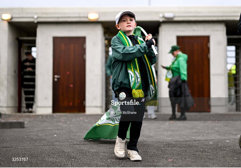 5 October 2025; Kerry FC supporter Arlo Brosnan, age 8, from Castleisland, Kerry, before the Sports Direct Men’s FAI Cup semi-final match between Shamrock Rovers and Kerry FC at Tallaght Stadium in Dublin. Photo by Ben McShane/Sportsfile