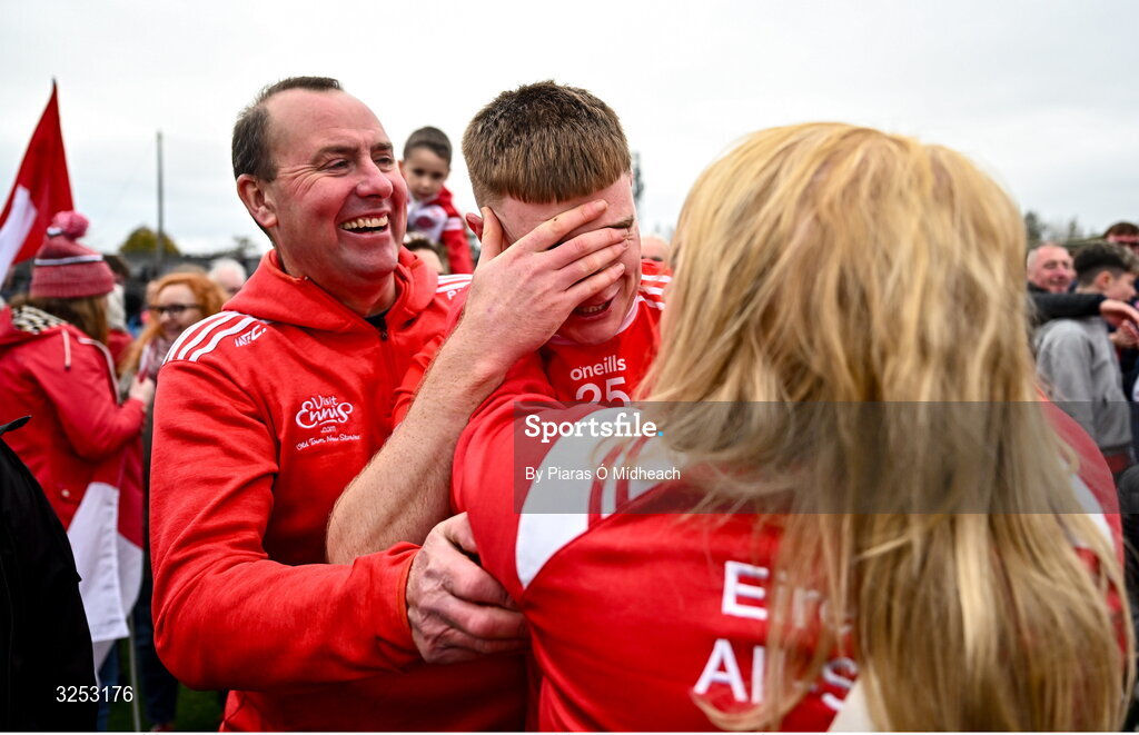5 October 2025; Tom Kavanagh of Éire Óg Ennis celebrates with supporters after their side's victory in the Clare County Senior Club Hurling Championship final match between Clooney Quin and Éire Óg Ennis at Zimmer Biomet Páirc Chíosóg in Ennis, Clare. Photo by Piaras Ó Mídheach/Sportsfile