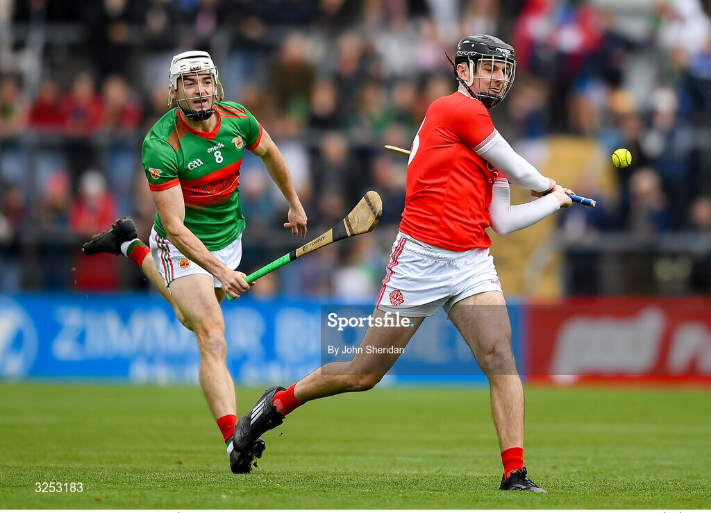 5 October 2025; Darren O'Brien of Éire Og in action against Ryan Taylor of Clooney Quin during the Clare County Senior Club Hurling Championship final match between Clooney Quin and Éire Óg Ennis at Zimmer Biomet Páirc Chíosóg in Ennis, Clare. Photo by John Sheridan/Sportsfile