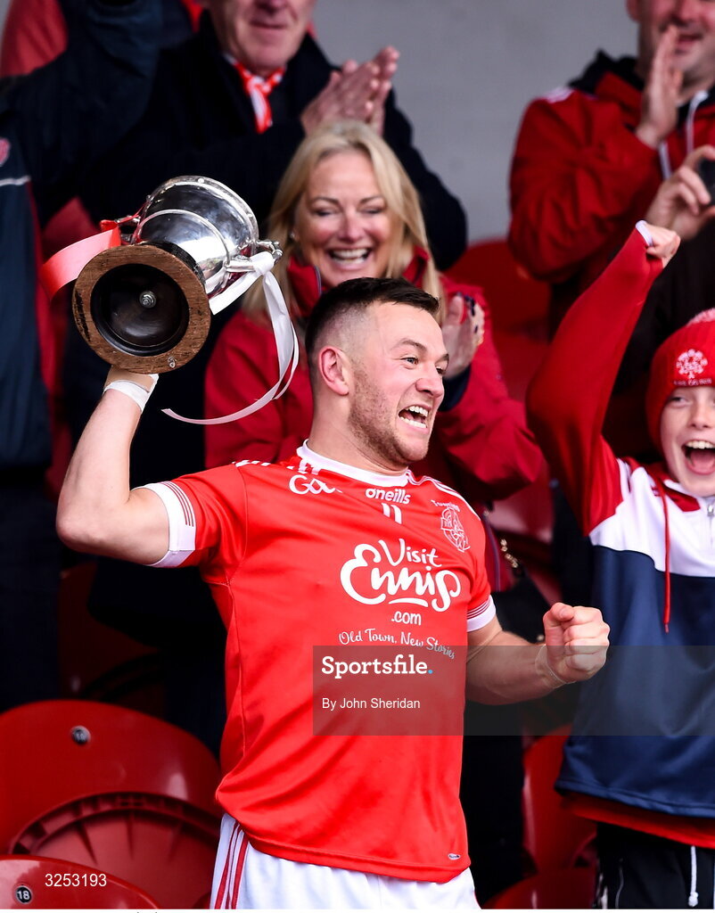 5 October 2025; Éire Óg captain David Reidy lifts the Canon Hamilton cup after winning the Clare County Senior Club Hurling Championship final match between Clooney Quin and Éire Óg Ennis at Zimmer Biomet Páirc Chíosóg in Ennis, Clare. Photo by John Sheridan/Sportsfile