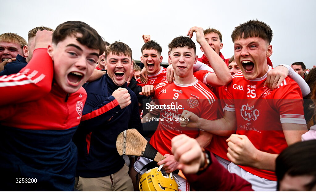 5 October 2025; Éire Óg Ennis players Darren Moroney, 9, and David Loftus, right, celebrate after victory in the Clare County Senior Club Hurling Championship final match between Clooney Quin and Éire Óg Ennis at Zimmer Biomet Páirc Chíosóg in Ennis, Clare. Photo by Piaras Ó Mídheach/Sportsfile