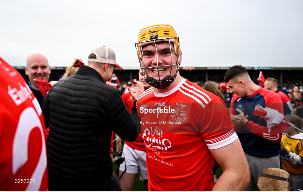 5 October 2025; Rian Mulcahy of Éire Óg Ennis celebrates after victory in the Clare County Senior Club Hurling Championship final match between Clooney Quin and Éire Óg Ennis at Zimmer Biomet Páirc Chíosóg in Ennis, Clare. Photo by Piaras Ó Mídheach/Sportsfile