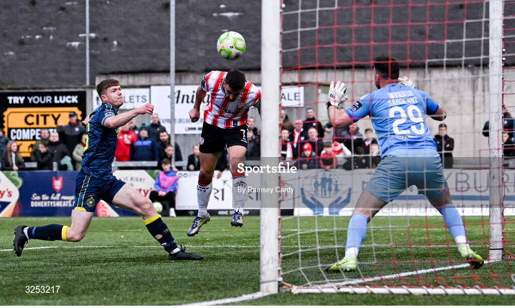 5 October 2025; Michael Duffy of Derry City heads his side's first goal past Sligo Rovers goalkeeper Sam Sargeant during the SSE Airtricity Men's Premier Division match between Derry City and Sligo Rovers at The Ryan McBride Brandywell Stadium in Derry. Photo by Ramsey Cardy/Sportsfile