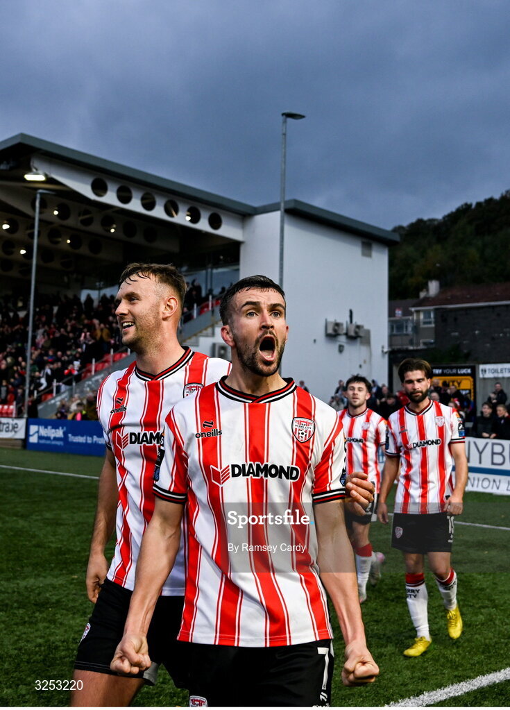 5 October 2025; Michael Duffy of Derry City celebrates after scoring his side's first goal during the SSE Airtricity Men's Premier Division match between Derry City and Sligo Rovers at The Ryan McBride Brandywell Stadium in Derry. Photo by Ramsey Cardy/Sportsfile