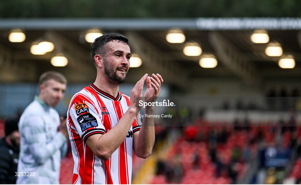 5 October 2025; Michael Duffy of Derry City after his side's victory in the SSE Airtricity Men's Premier Division match between Derry City and Sligo Rovers at The Ryan McBride Brandywell Stadium in Derry. Photo by Ramsey Cardy/Sportsfile